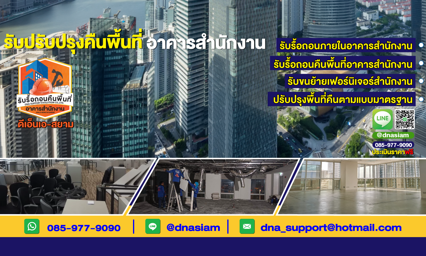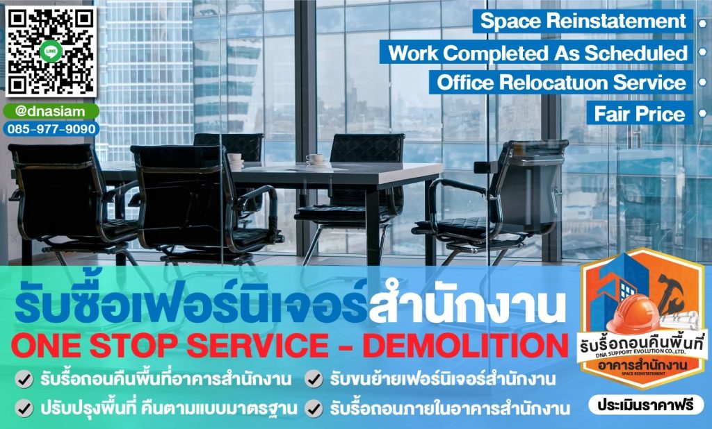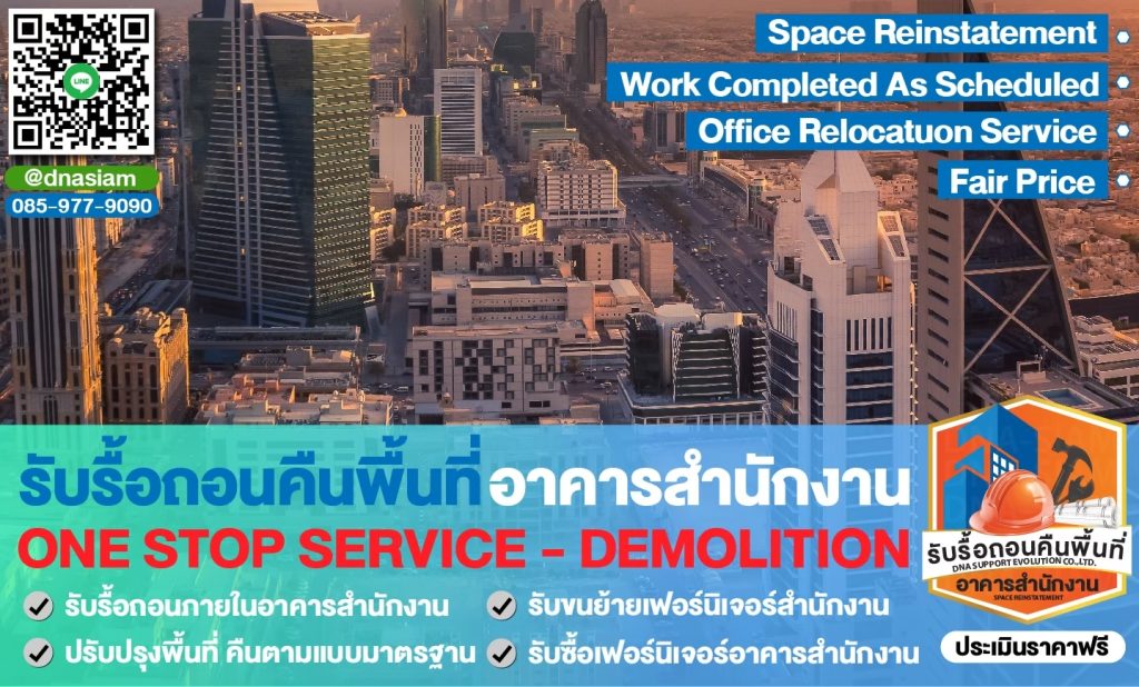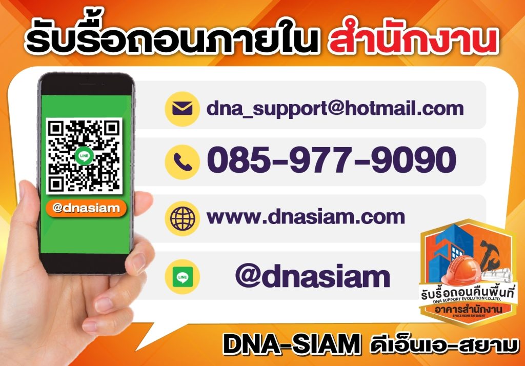 หากต้องการบริการรื้อถอนและคืนพื้นที่สำนักงานที่ได้มาตรฐาน ปลอดภัย และตรงเวลา ติดต่อ บริษัท ดีเอ็นเอ โทร 085-977-9090 ทีมงานของเราพร้อมให้บริการคุณ!